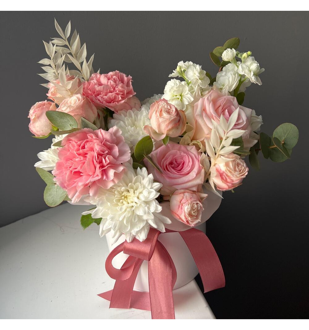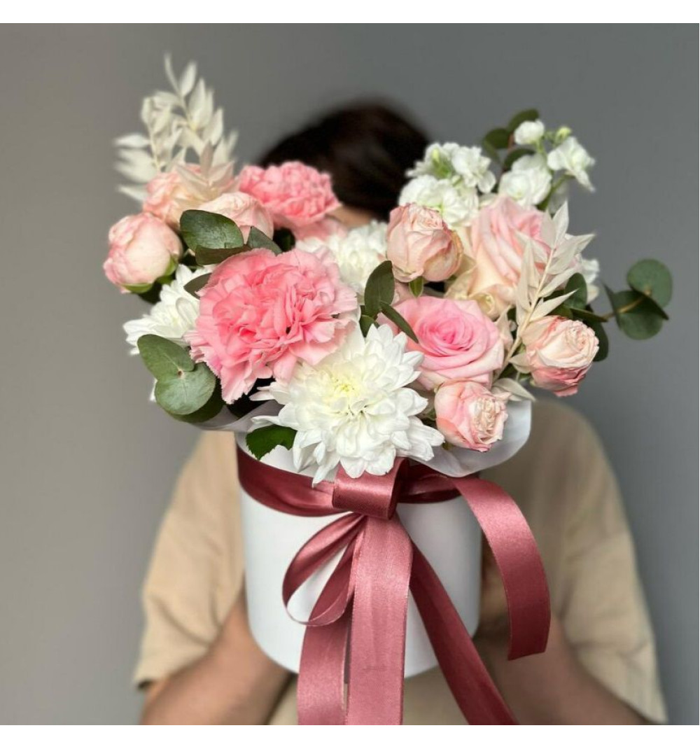 Купить Кустовые пионовидные розы, маттиола и хризантема в шляпной коробочке в Сарыагаше за 15 000 ₸ | интернет-магазин «Guls»